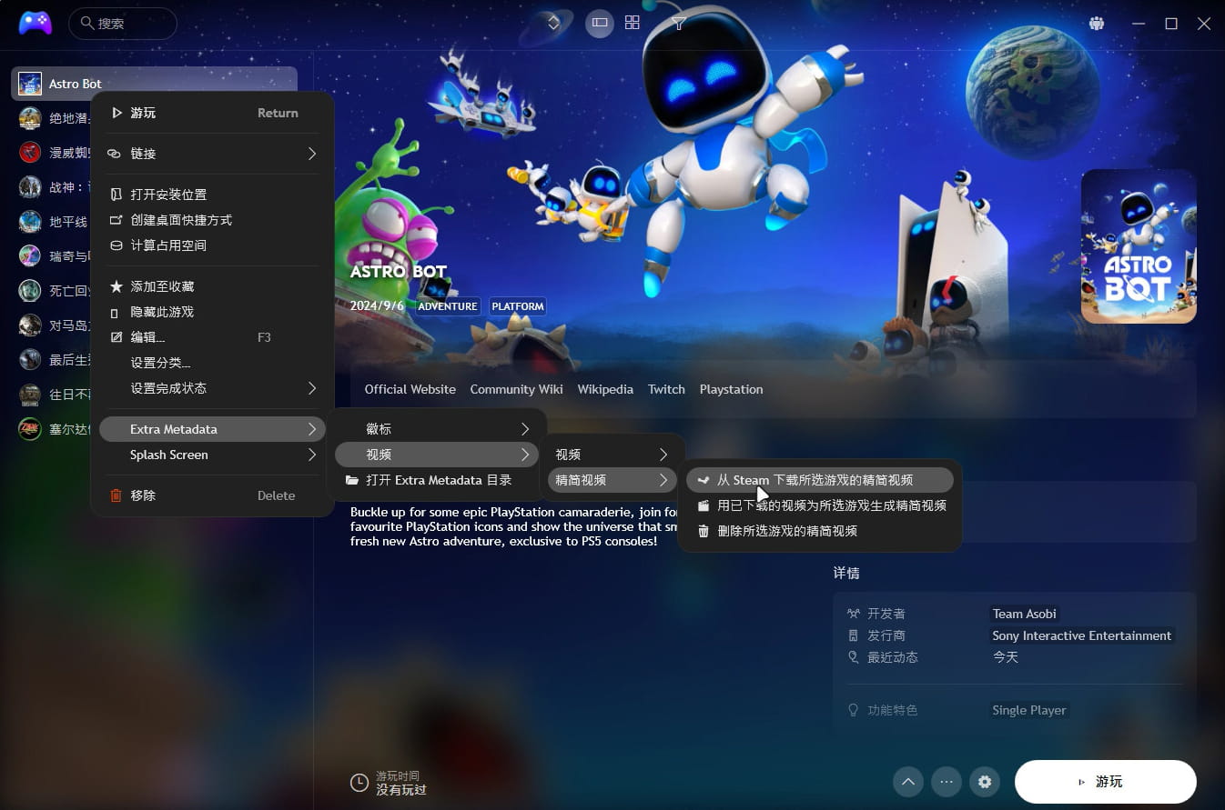 这是装了PS5主题的最新Playnite, 已经可以显示游戏视频,效果十分丝滑,之前的视频分享的软件,由于时间久了需要更新,于是重新打包了一份。打包版的软件本体、主题插件都更新到了最新版,PS5主题都设置好了,解压即用.